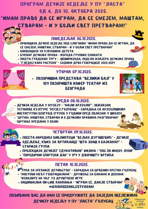 Дечија недеља у ПУ „Ласта“ Голубац обележиће се од 06. до 10. октобра уз учешће